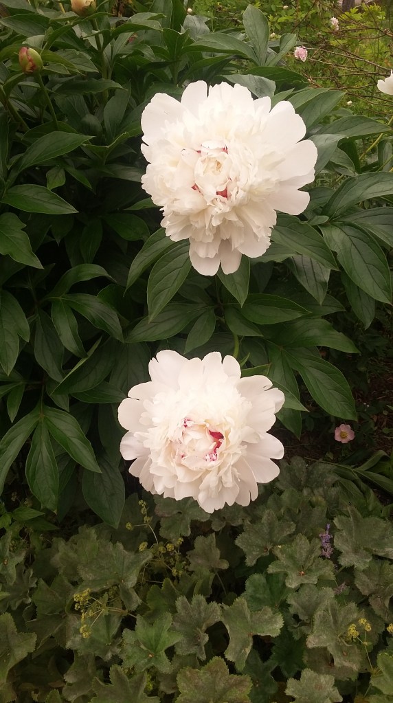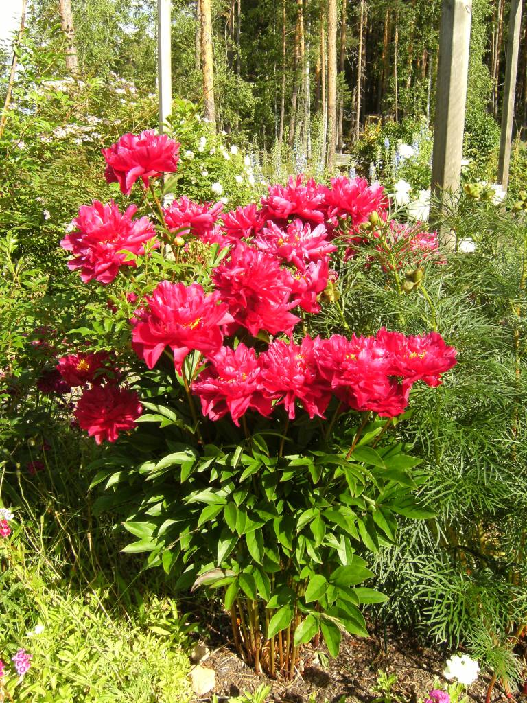Bondpion, Paeonia x festiva är doftlös och det finns 12 sortnamn. Jag har endast ett par av dem i min trädgård eftersom jag helst vill ha blommor med doft. De är dock väldigt fina och härdiga och en av dem är från en mycket gammal gård (1500-tal ev. 1400-tal). Ja, visserligen är gården gammal gård men att pionen är riktigt så gammal tror jag knappast. Men det kan vara intressant att försöka ta reda på lite mer om vad det kan vara för sort.