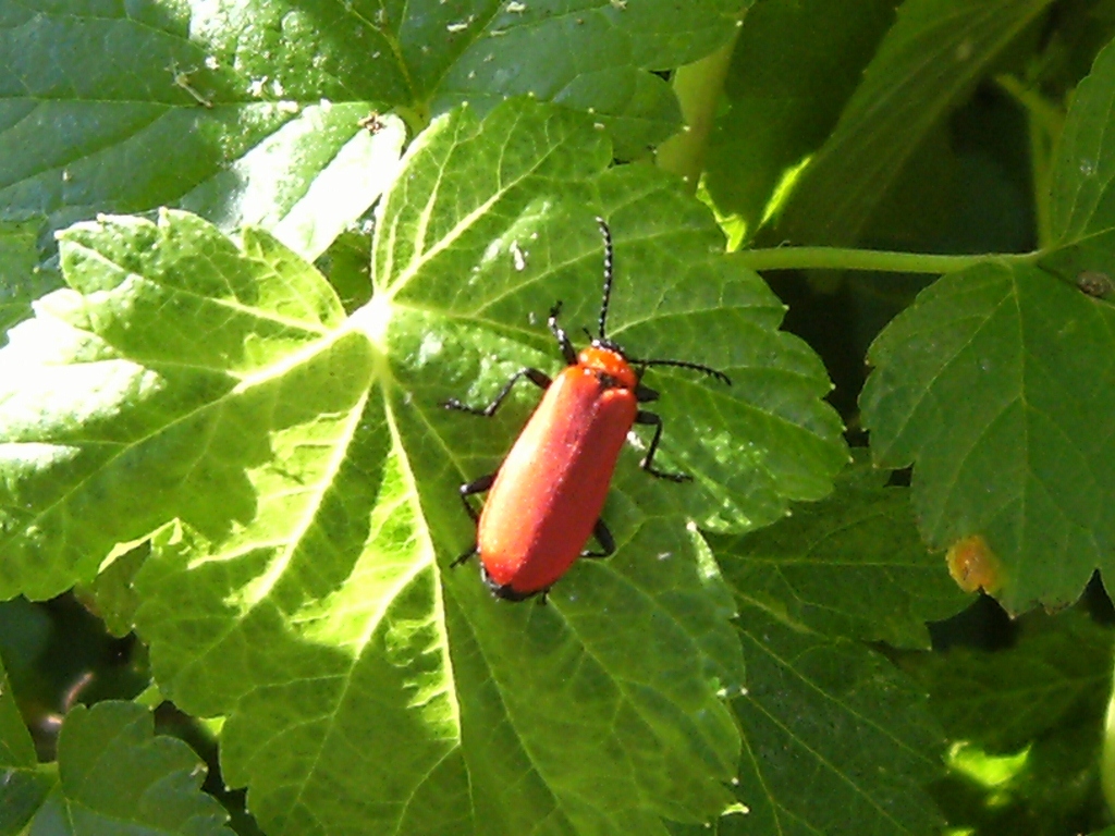 Jag har en del andra röda insekter, förutom liljebaggarna, som jag har undrat över vad de kan vara för kryp. Det här är troligen Pyrochroa coccinea om det som står på webbsidan kryp i naturen stämmer. På svenska heter den Stor kardinalbagge. Mer att läsa om den finns på webbsidan.