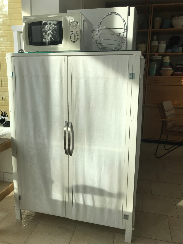 Det blev väldigt fint med en lampa i skåpet, lyser genom det vita linnet, hela skåpet sprider ett milt ljus och det blir väldigt lätt att se vad som finns i skåpet. … ska ta en bild på det med. Det är lätt att byta tyg. Till jul, påsk eller midsommar kan man ju ha ett annat tyg.