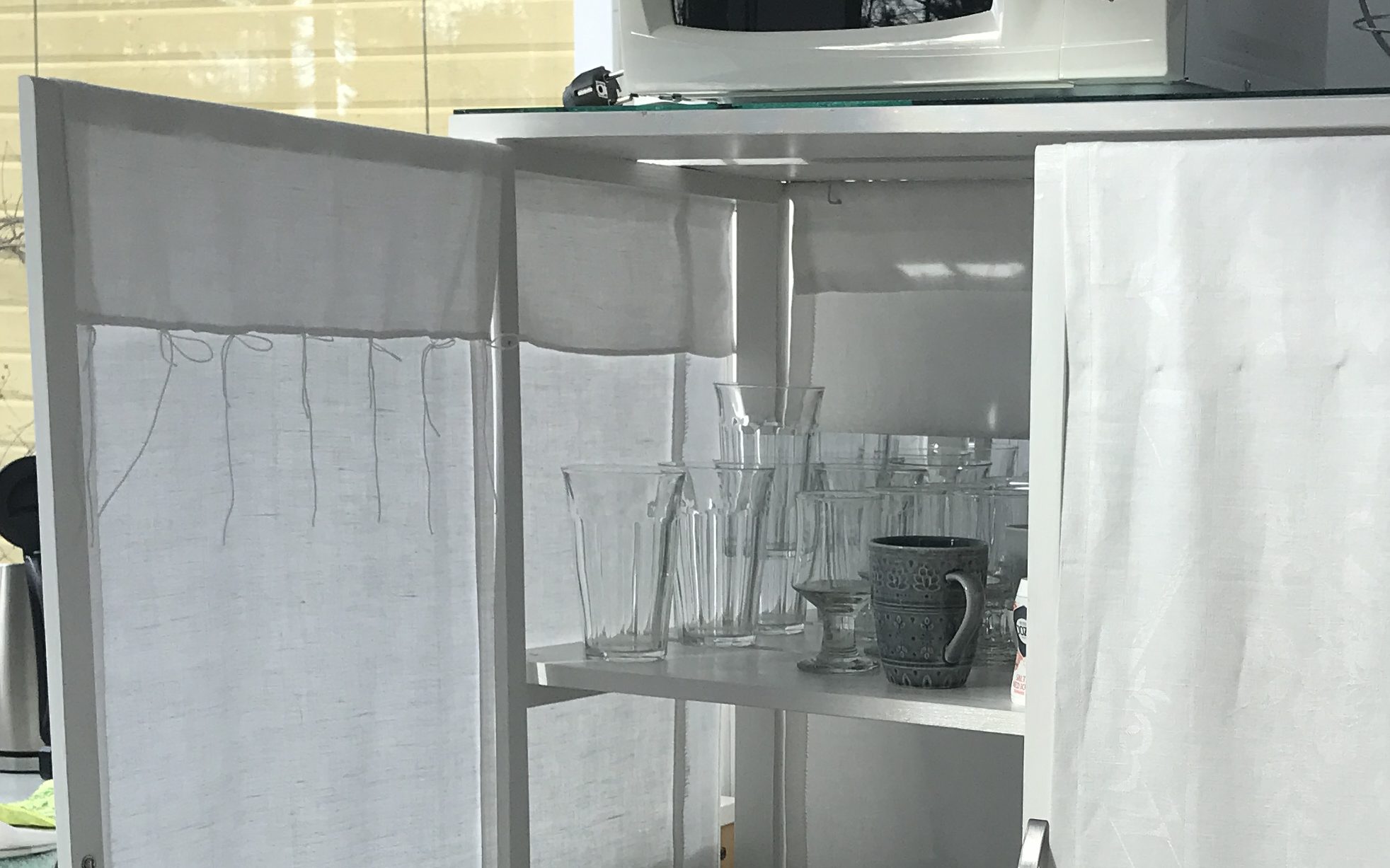 Lagerhyllan för frukostporslin, glas och bestick, ville jag däremot dölja och kom på att nog skulle väl linnedukarna kunna komma till sin rätt som väggar på den snickrade hyllan.