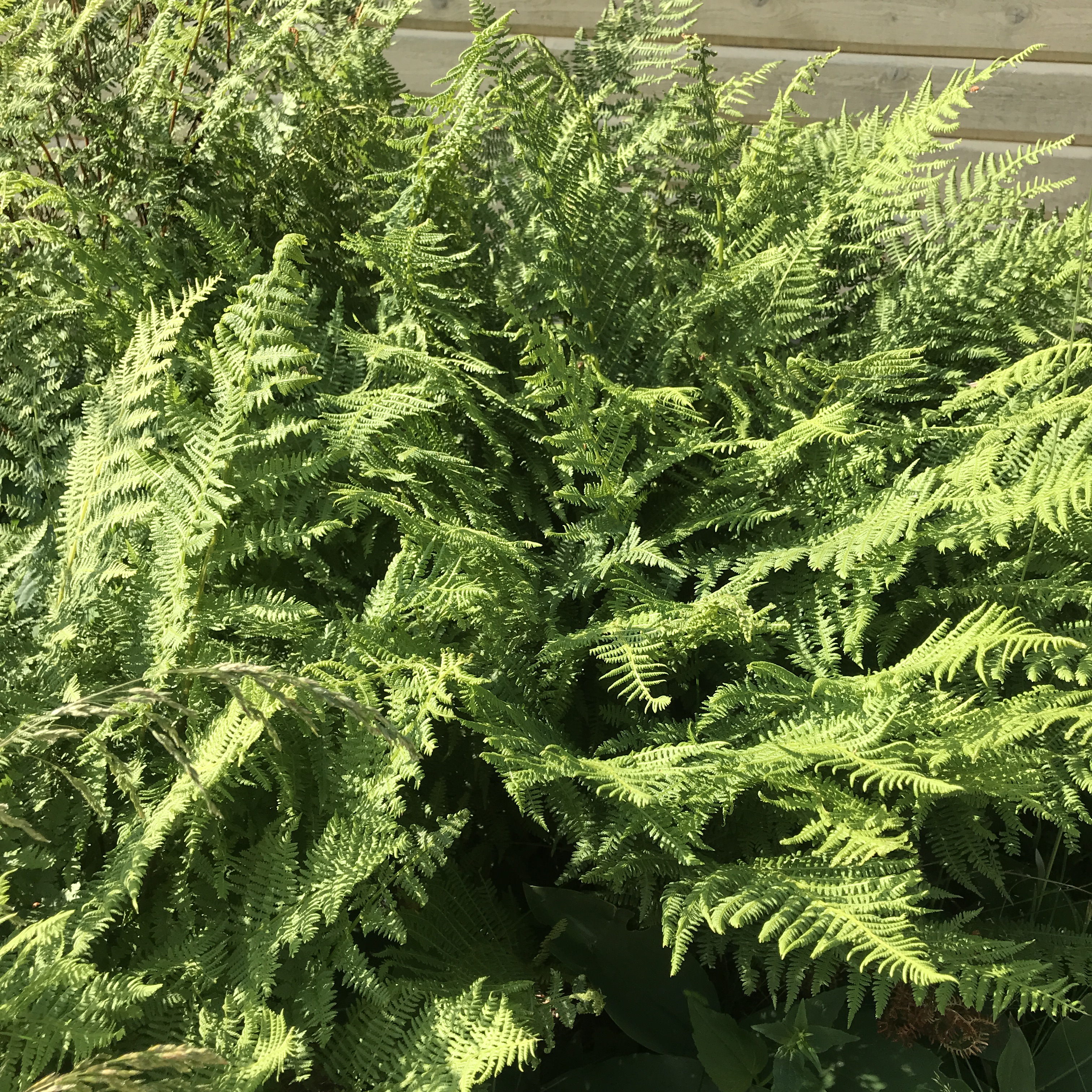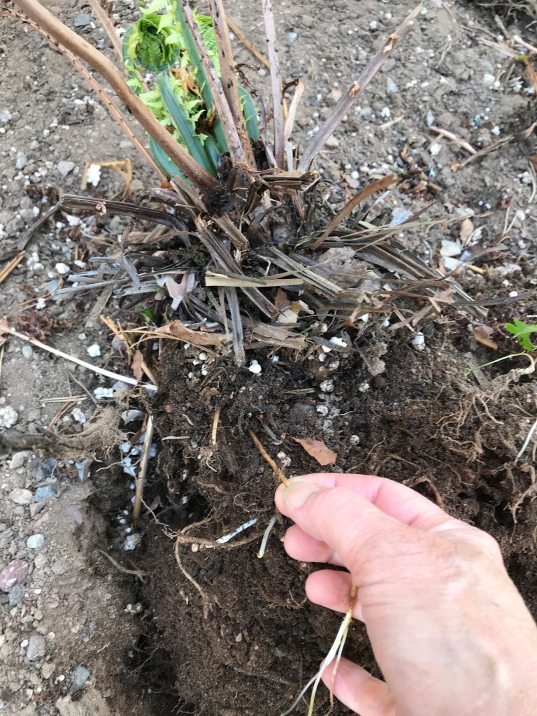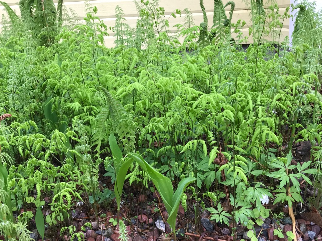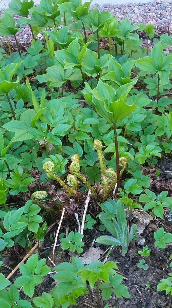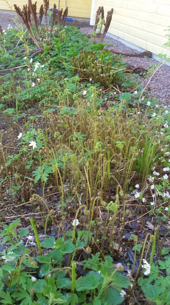 Av de tre rabatterna det är fråga om, de där jag efter många år lyckats få skogsväxterna att föröka sig i, har en klarat sig från kirskålen (där finns skogsfräken istället), där har den fina låga ormbunken spridit sig väl. Så då har jag lite att ta av för att kunna återplantera efter min rensning.