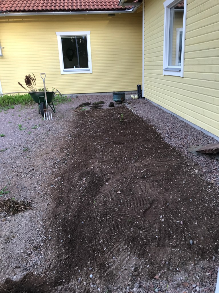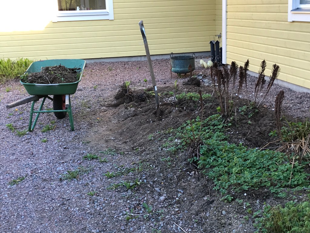Så i höstas rensades den ena rabatten och nu är den andra klar! Med grep har kersen lyfts upp och ur har jorden ruskats, plantorna som ska vara kvar är upptagna ur jorden och rensade underifrån