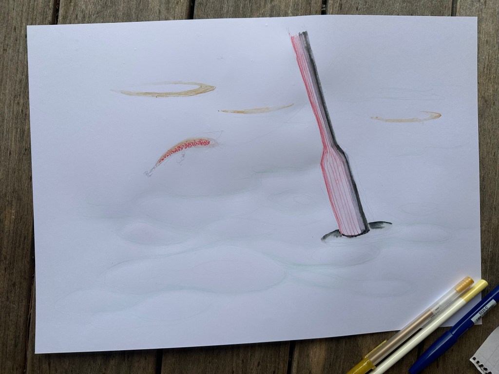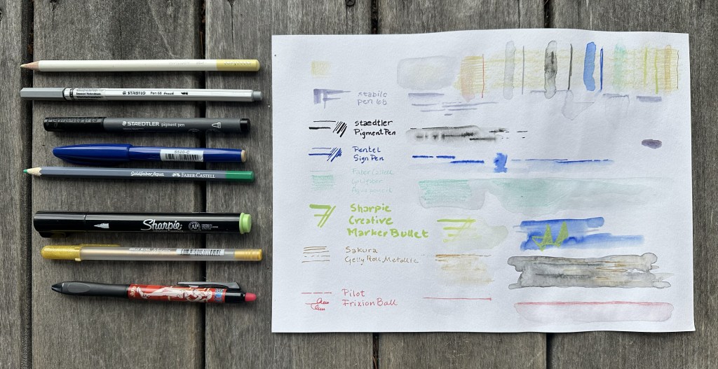 - Pilot, Frixion Ball – en klart röd ”kulspetspenna”. Tecknar tunna linjer. De löser otroligt lätt upp sig i vatten även efter att de torkat. Den upplösta färgen blir svagt kallrosa i tonen och lägger sig långt bort i bilden. Den följer väldigt lätt med penseln och är svår att föra ut jämnt över ytan. Den går att sudda.