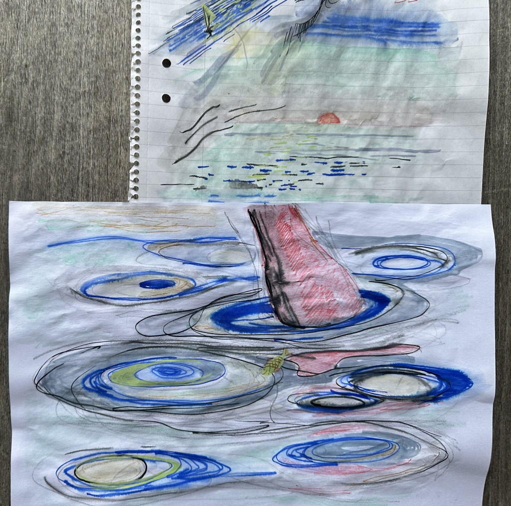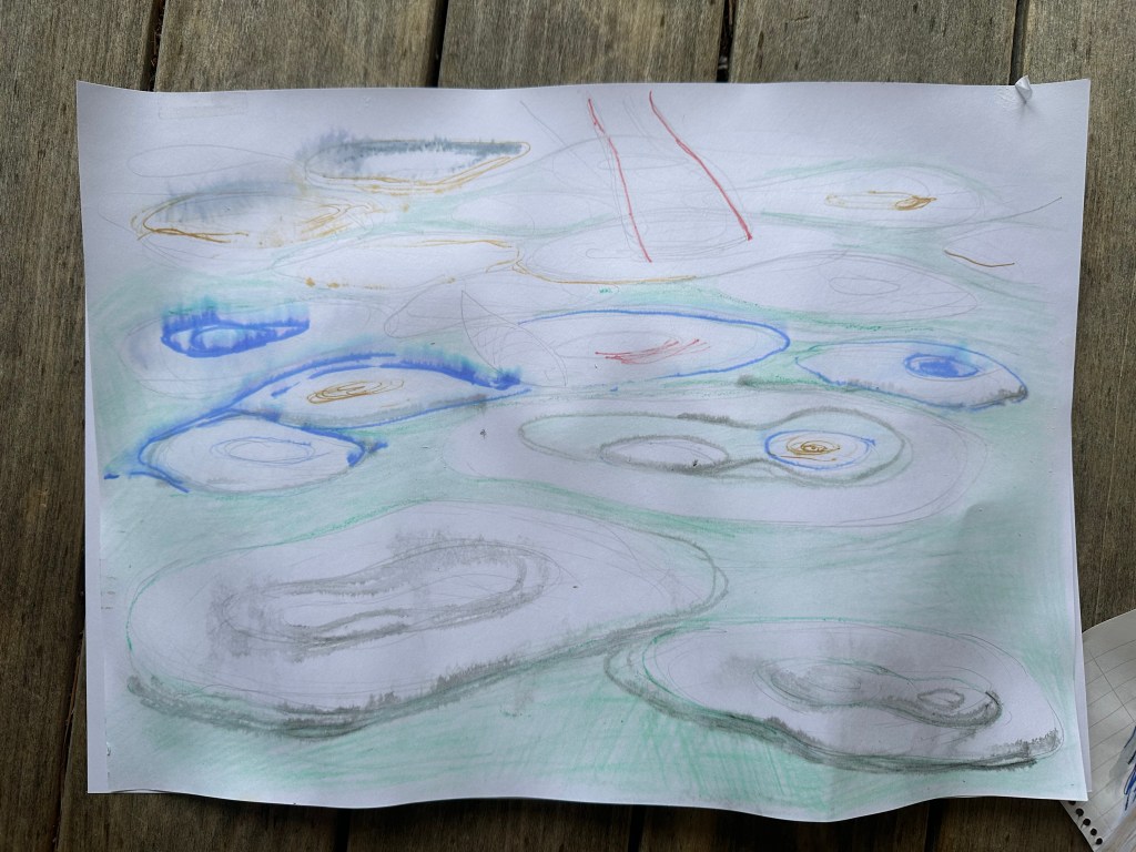 Först undersöker jag pennorna. Vilka färger de har och hur de fungerar med vatten, på pappret och mot varandra.